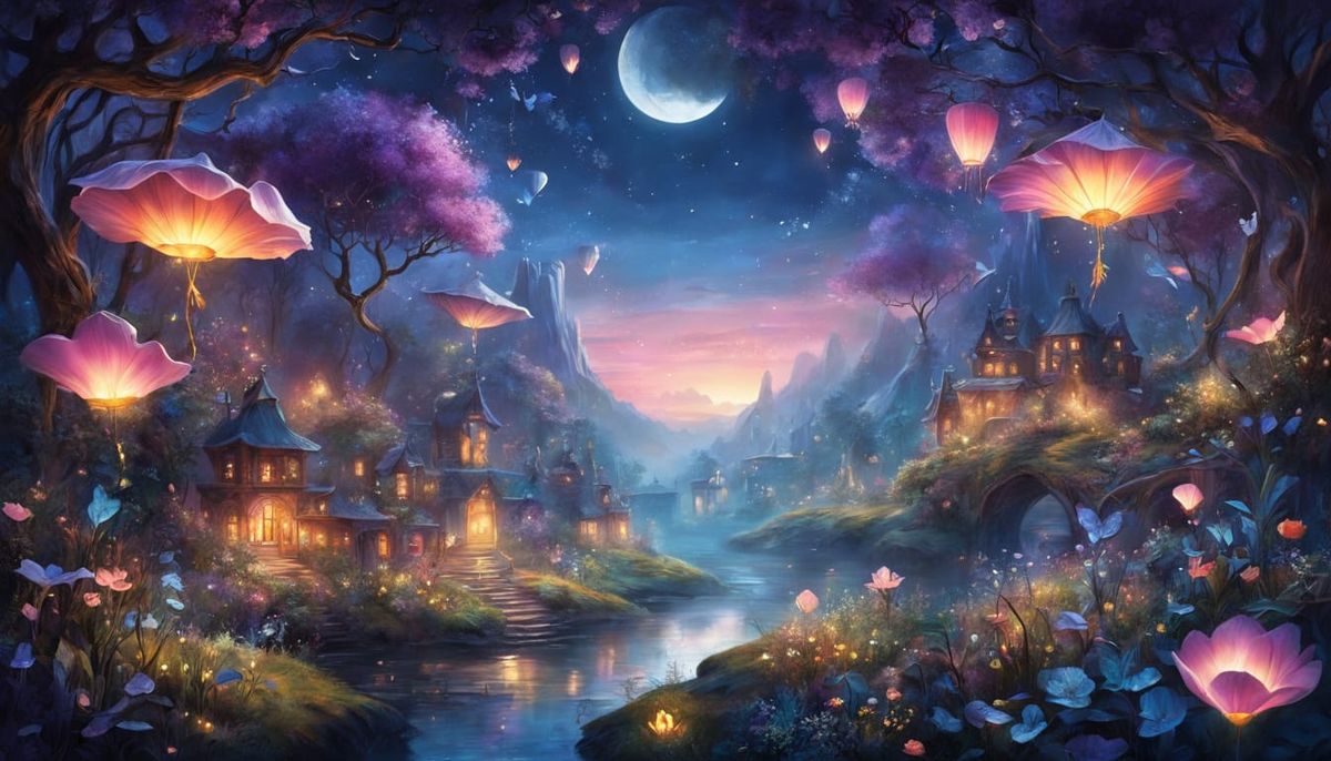 A striking picture of a surreal landscape bathed in moonlight. The vibrant oil painting features delicate florals and greenery, fireflies, and gentle purple hues in a nocturnal, fantasy world.
