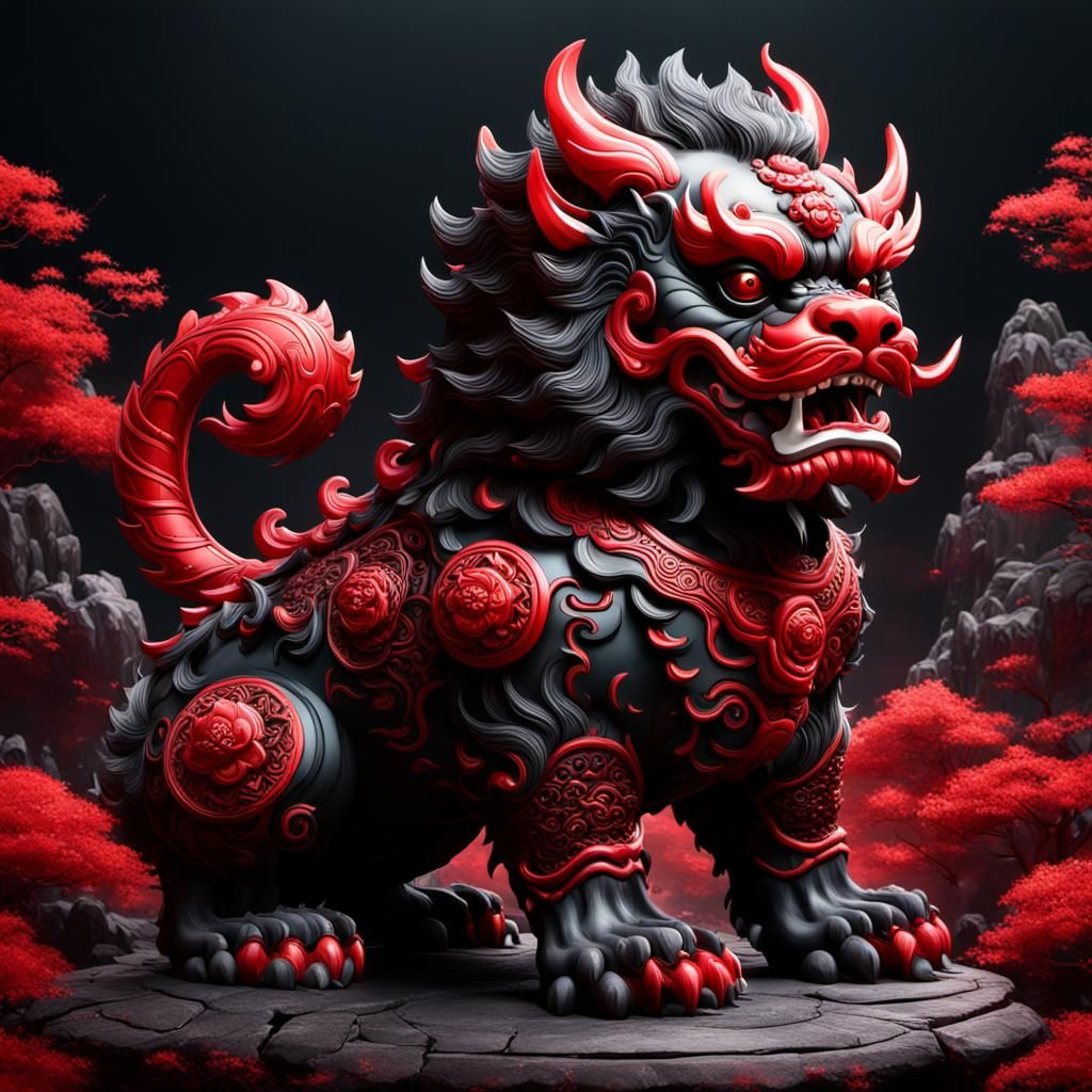 This image shows a red and black foo dog in a fantasy concept art style. The detailed matte painting features deep color, intricate details, and complementary colors in 8k resolution.