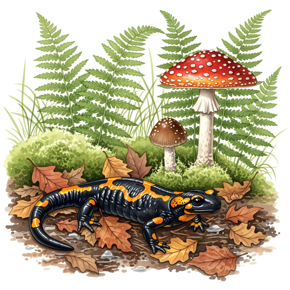 This image shows a fire salamander in its natural forest habitat. The watercolor illustration captures the amphibian amongst leaves, ferns, moss, and toadstools with great detail.