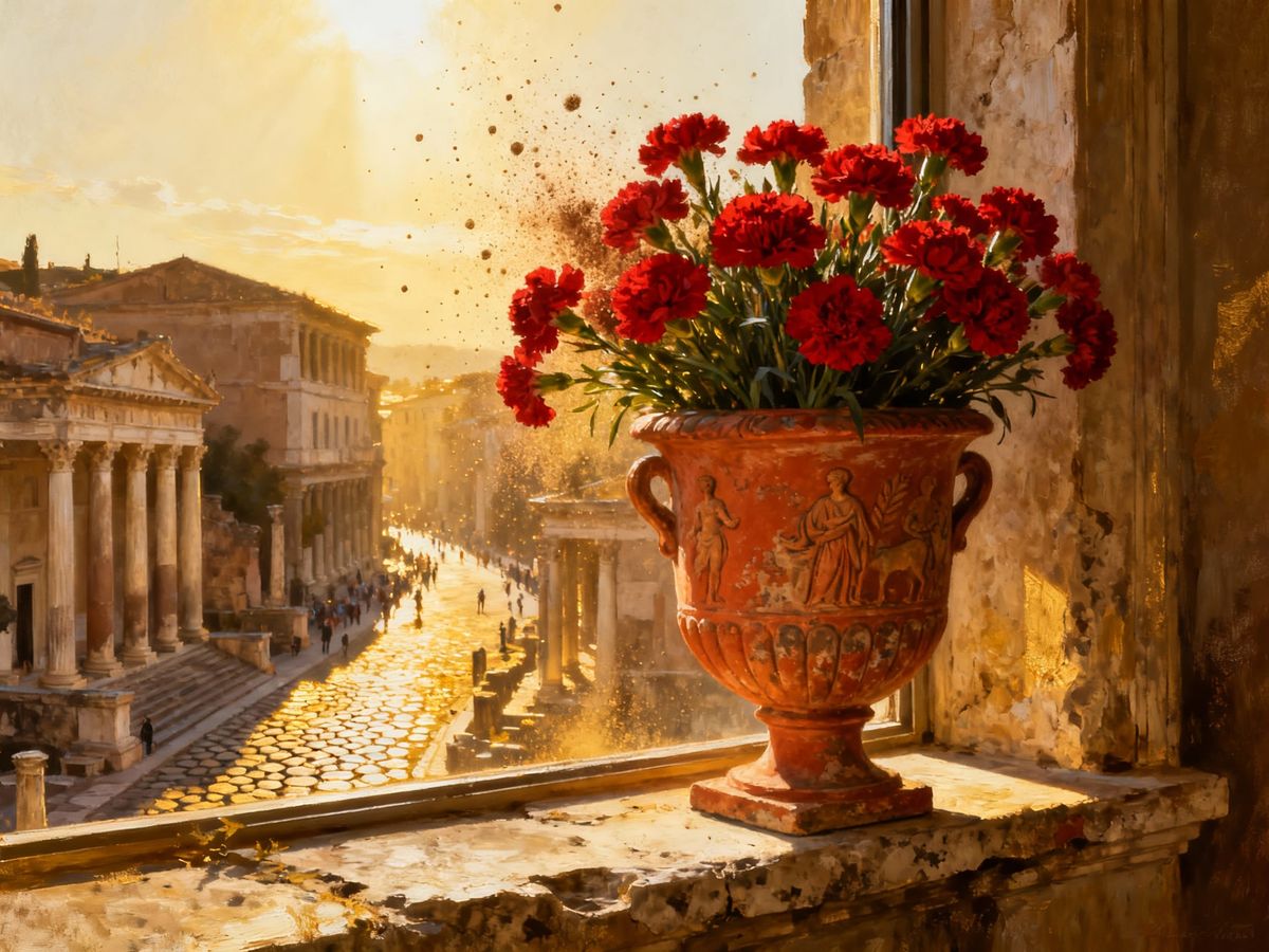 This image shows a detailed classical oil painting of a Roman urn filled with red carnations on a windowsill. It overlooks a sunlit ancient Roman street, with dramatic light and rich textures.