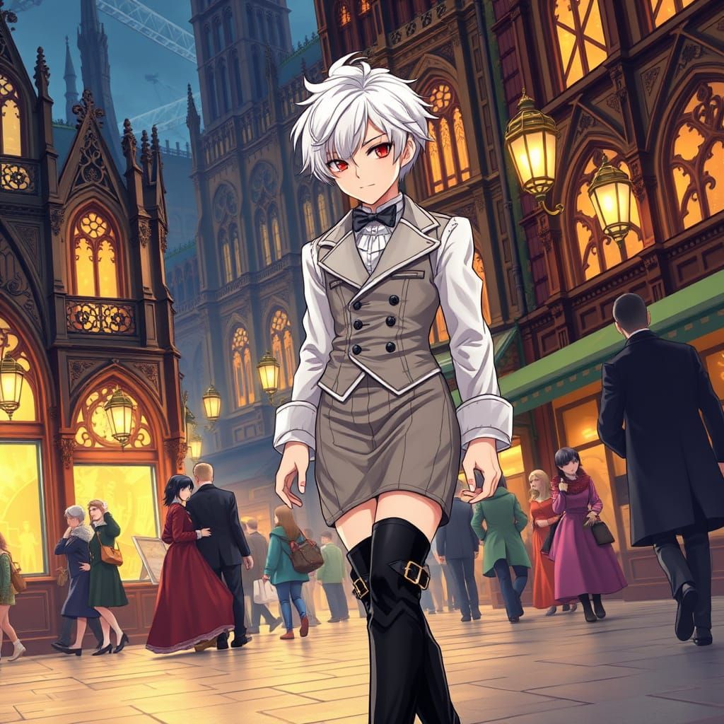 This image depicts a young, elegant boy with short, white hair and piercing red eyes, dressed in intricate Victorian attire, walking through a lively, gaslit town square surrounded by ornate architecture and vibrant passersby, rendered in a manga-style illustration with bold lines and vibrant colors, evo...