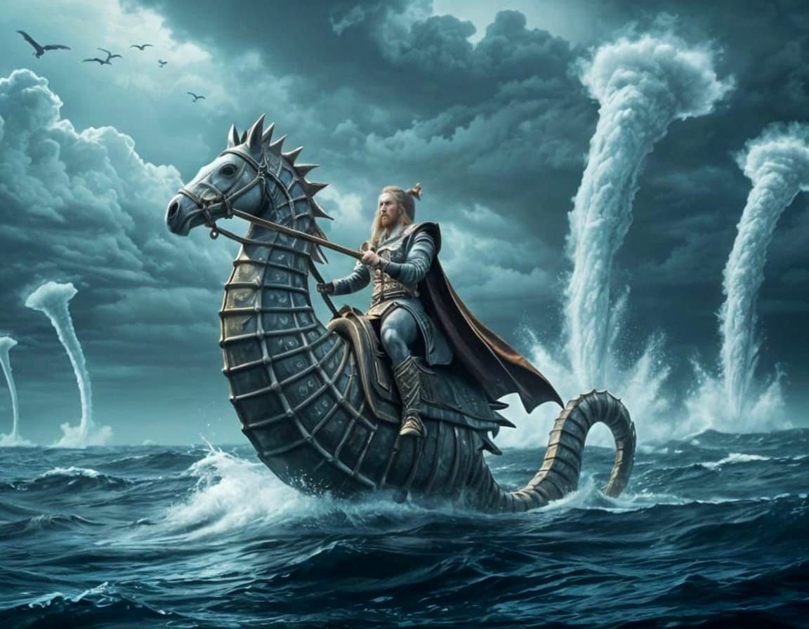 This image depicts an Atlantean warrior mounted on a giant seahorse, navigating a treacherous ocean with waterspouts and storm clouds. Rendered in a detailed, atmospheric digital matte painting style.