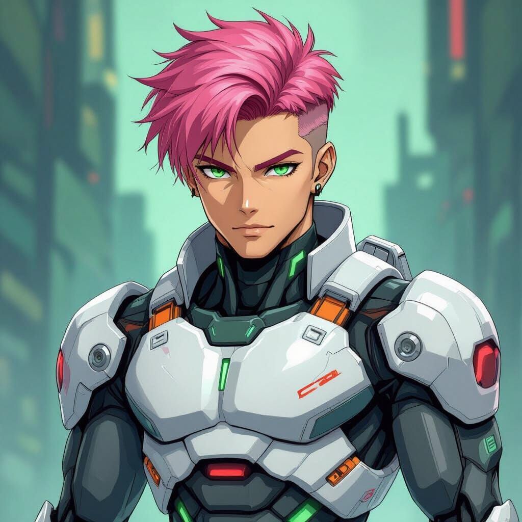 This image shows a handsome, slender man with pink hair and piercing green eyes, clad in advanced body armor. The artwork features a dynamic, vibrant, anime style with robotic elements.