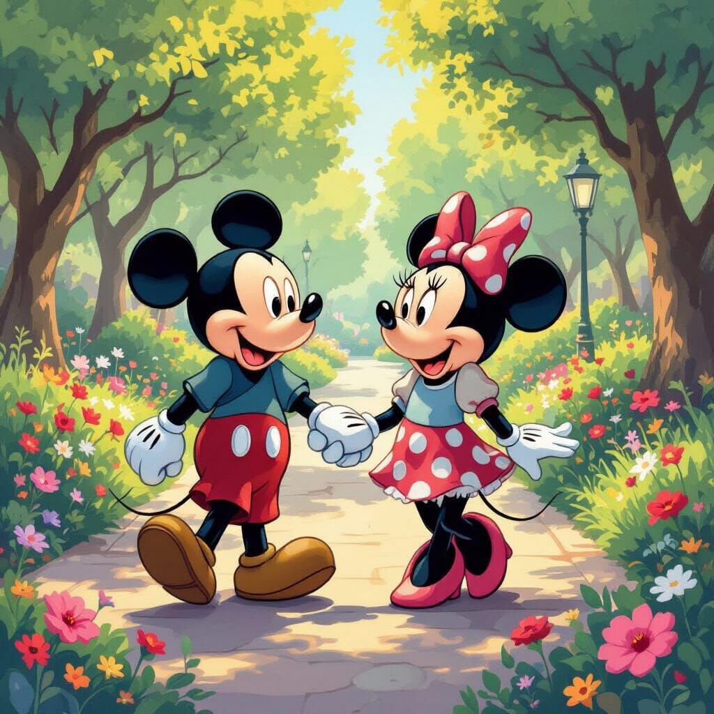 This image shows Mickey and Minnie Mouse walking hand-in-hand through a sunlit park filled with flowers. The whimsical scene is depicted in a vibrant cartoon style.