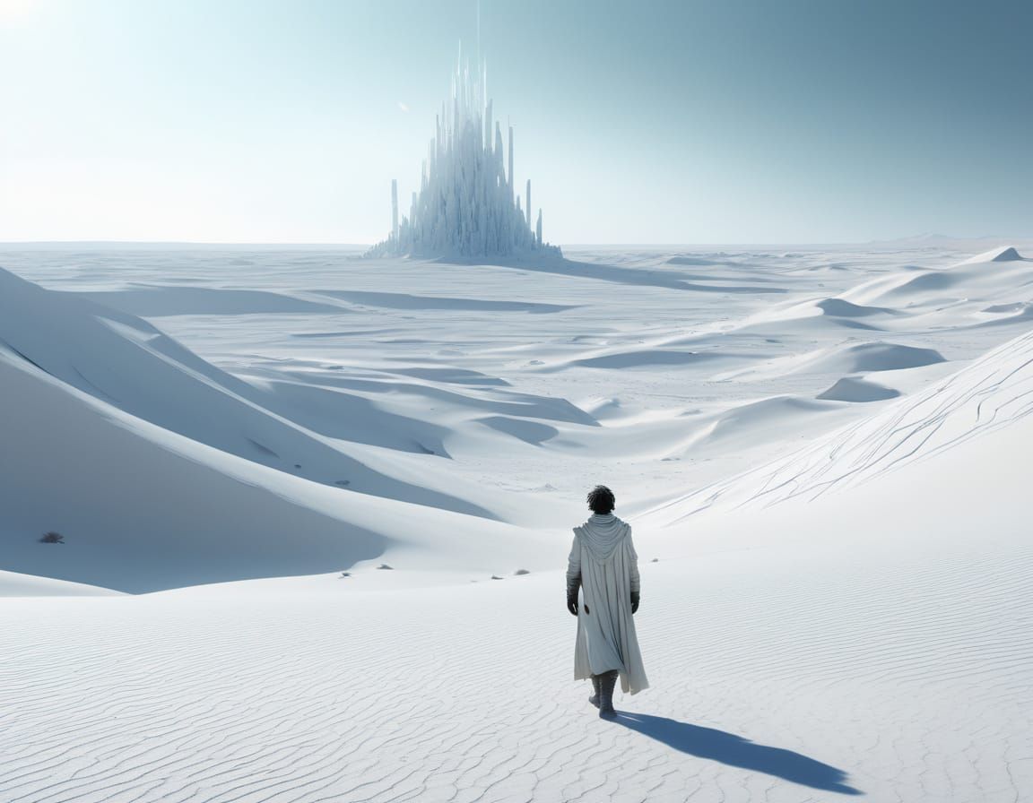 This image shows a lone figure in an otherworldly desert environment. Crystalline structures form a unique hairstyle, illuminated by subtle neon light in a sci-fi aesthetic. Wide shot, dramatic lighting, high detail.