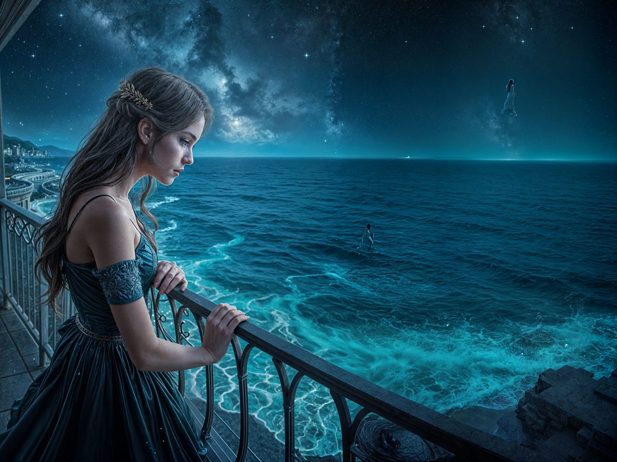 A surreal portrait of a young princess gazing out at a magical sea under a starry night sky. The image conveys peace and beauty with intricate details and dynamic lighting.
