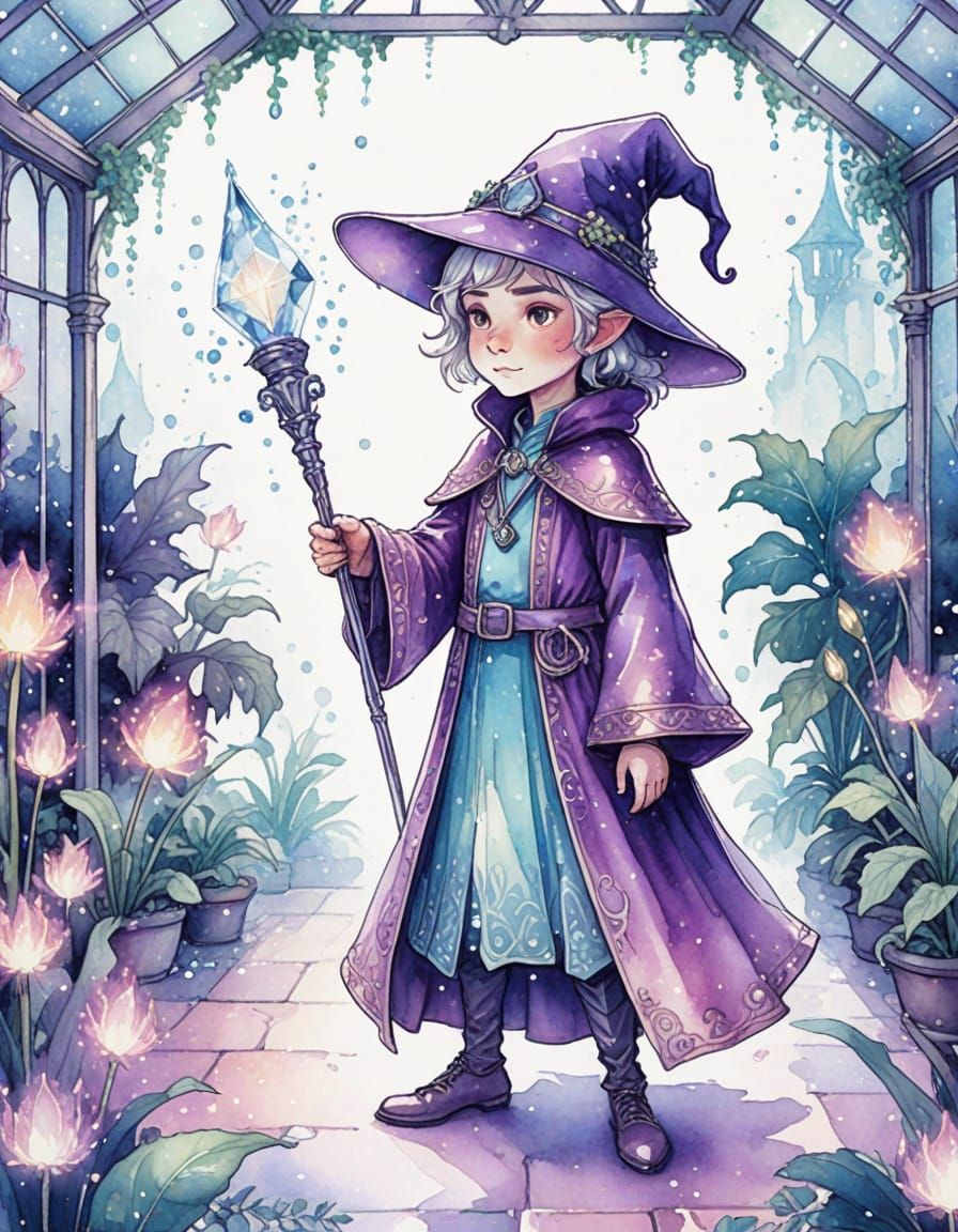 This image shows a cheerful young wizard holding a scepter inside a magical greenhouse. The watercolor and ink painting style features sparkling crystal details and glittering particles with soft, vibrant colours.