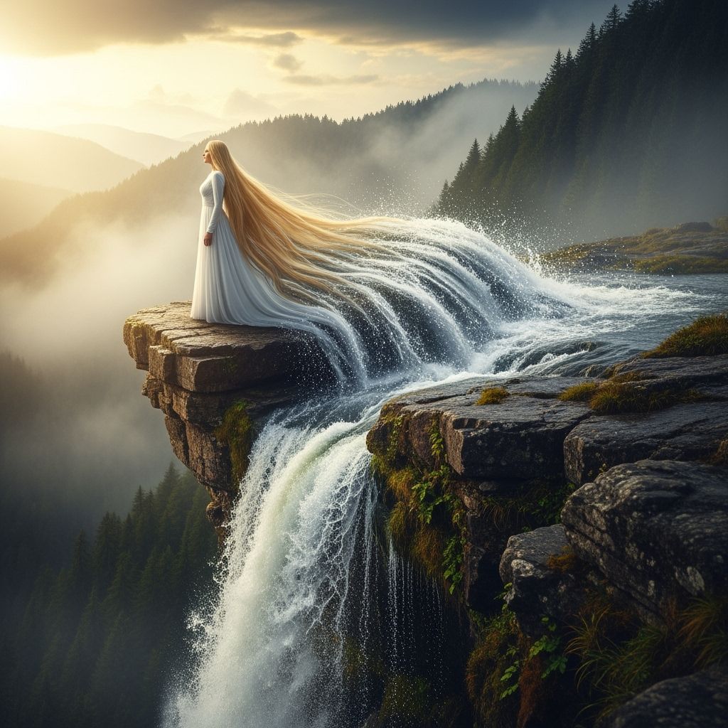 This image shows a woman on a cliff, her blonde hair transforming into a waterfall. Sunlight pierces dramatic clouds, creating a halo effect in this photorealistic fantasy scene with cinematic lighting.
