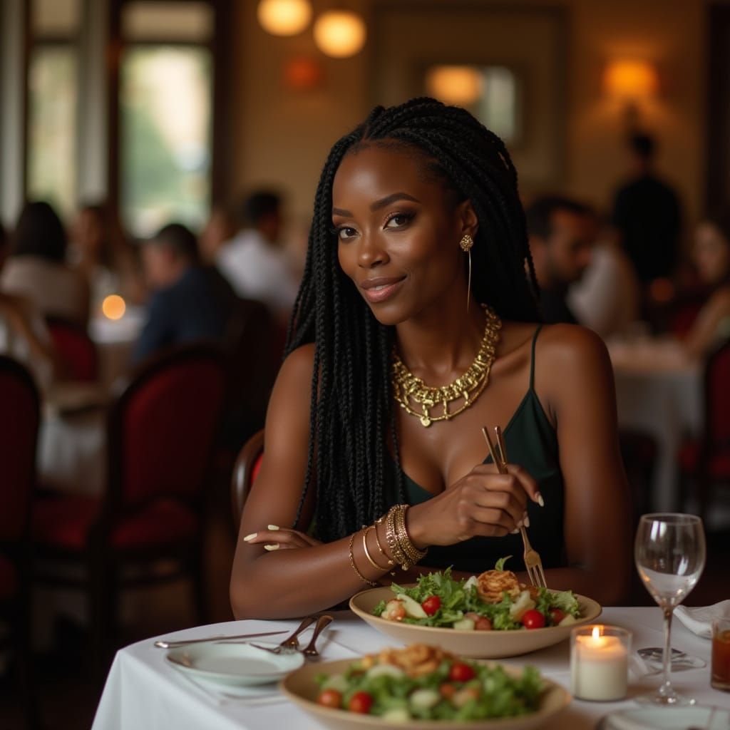 This hyperrealistic image captures a 30-year-old Black woman with braided hair dining in a sophisticated restaurant. She is elegantly dressed in evening attire, enjoying a salad.