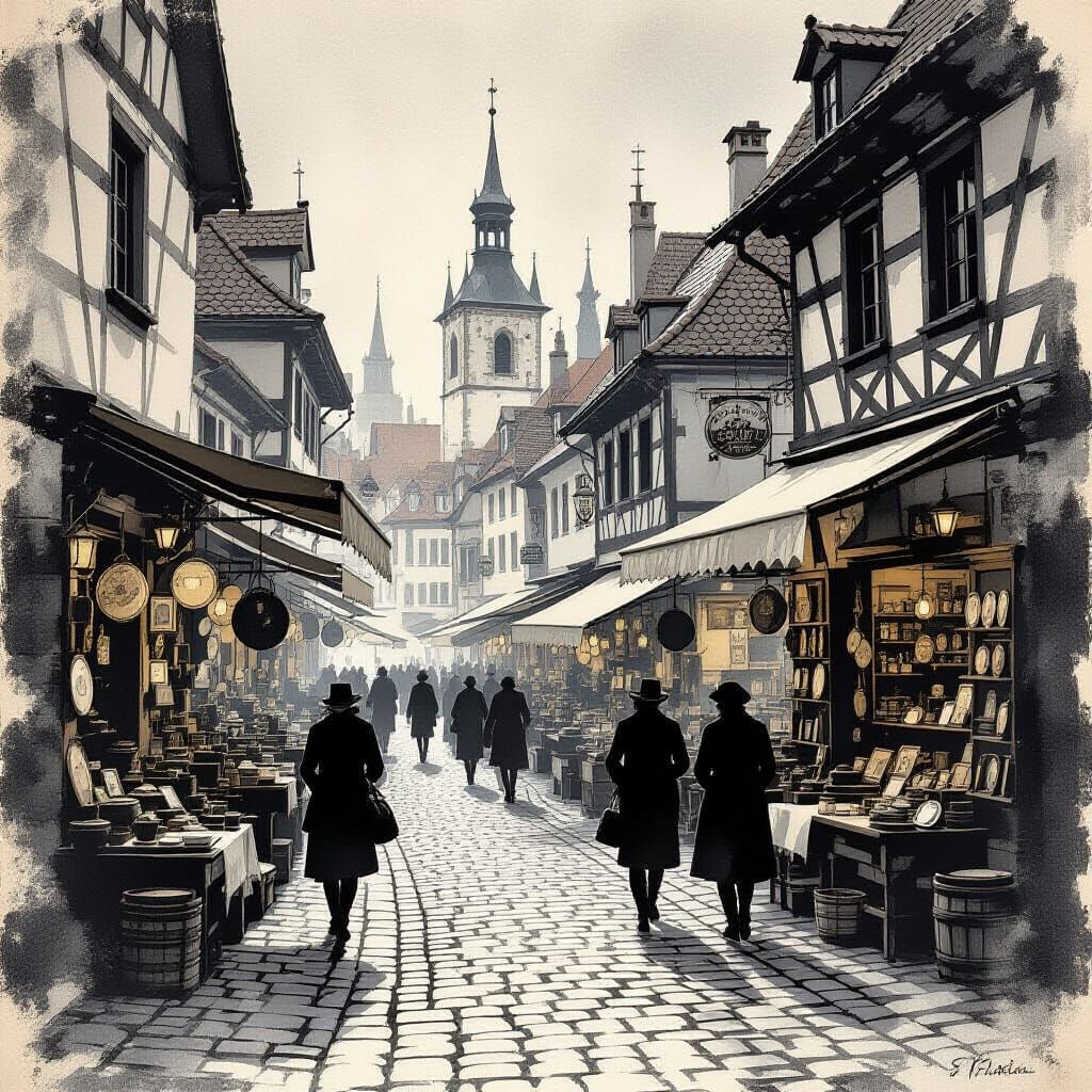 A monochromatic image depicts a vintage marketplace in a European town. Silhouetted figures move among antique stalls on cobblestone streets, creating a lively scene reminiscent of ink wash paintings.