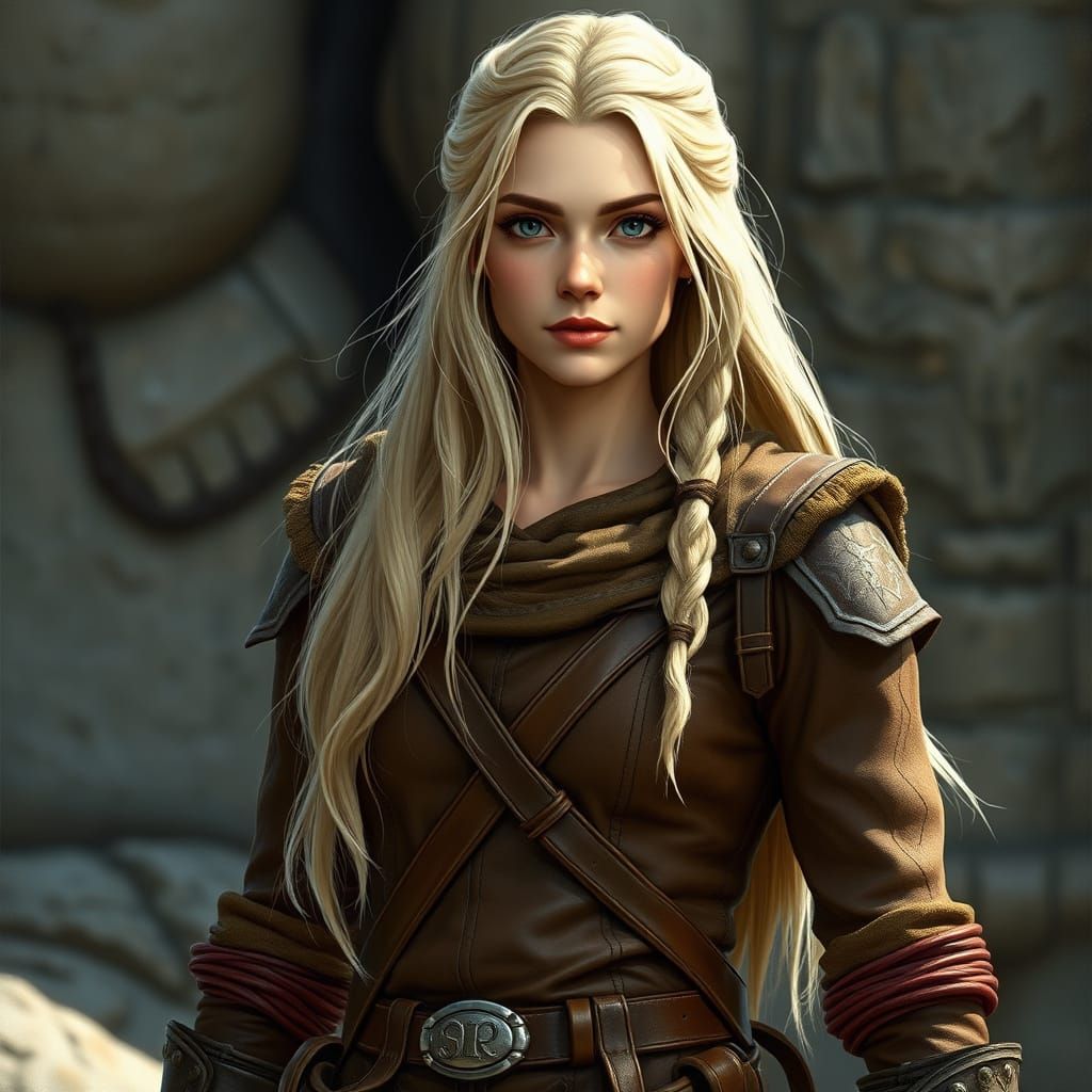 This image shows a Nord woman in leather armor, standing tall with blonde hair and blue eyes. The character blends compassion and strength in a stylized realistic, cinematic style.