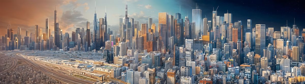 This image showcases a hyperdetailed cityscape featuring towering skyscrapers and a prominent skyline, rendered as a digital matte painting. The artwork is highly detailed with a hyperrealistic aesthetic.