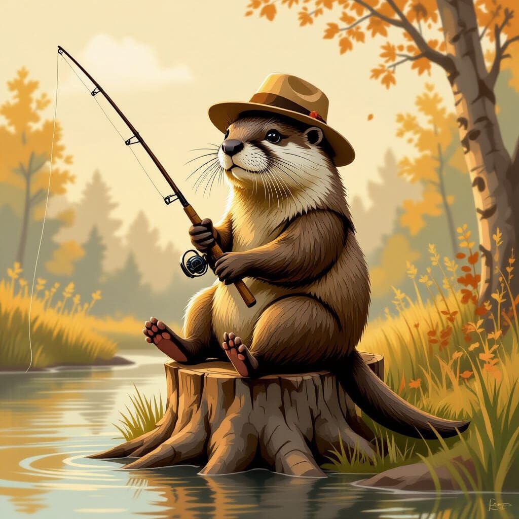 A charming image of an otter dressed for fishing. The digital artwork features warm, earthy tones and whimsical details, reminiscent of storybook illustrations.