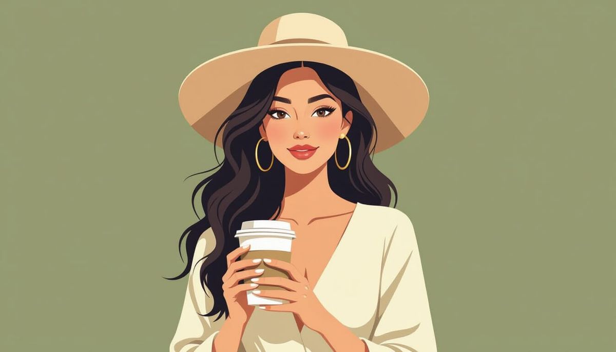 Minimalist flat illustration of a stylish woman with long wavy black hair wearing a wide-brimmed beige sunhat, holding a takeaway coffee cup...