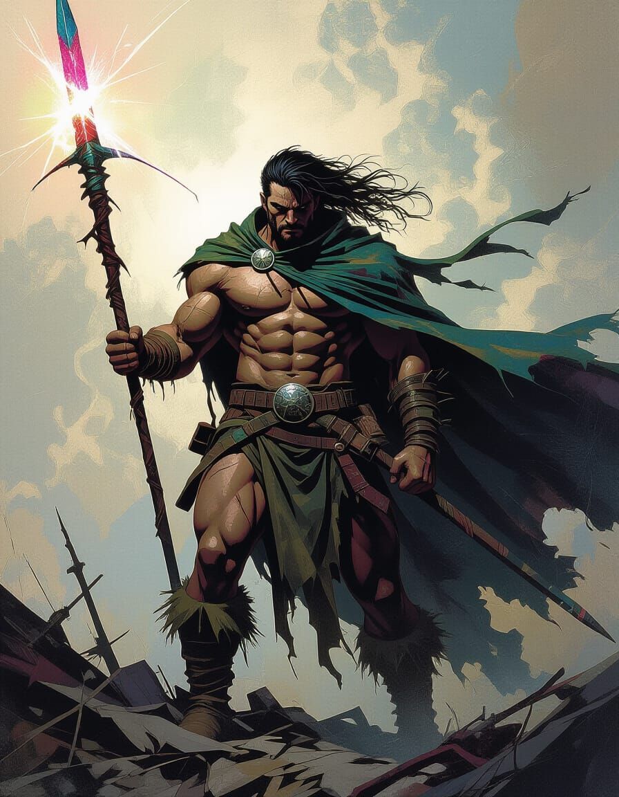 This image shows a powerful, post-apocalyptic nomad with exaggerated muscles, wielding a glowing spear. The art features abstract, textured chaos and dynamic paneling.