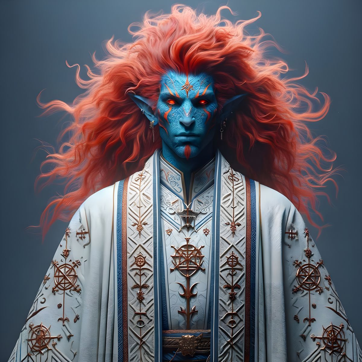 This image shows a highly detailed and photorealistic Firbolg priest with striking blue skin and fiery red hair. The character wears traditional sacred vestments with intricate symbols, embodying a blend of spiritual tranquility and raw power.