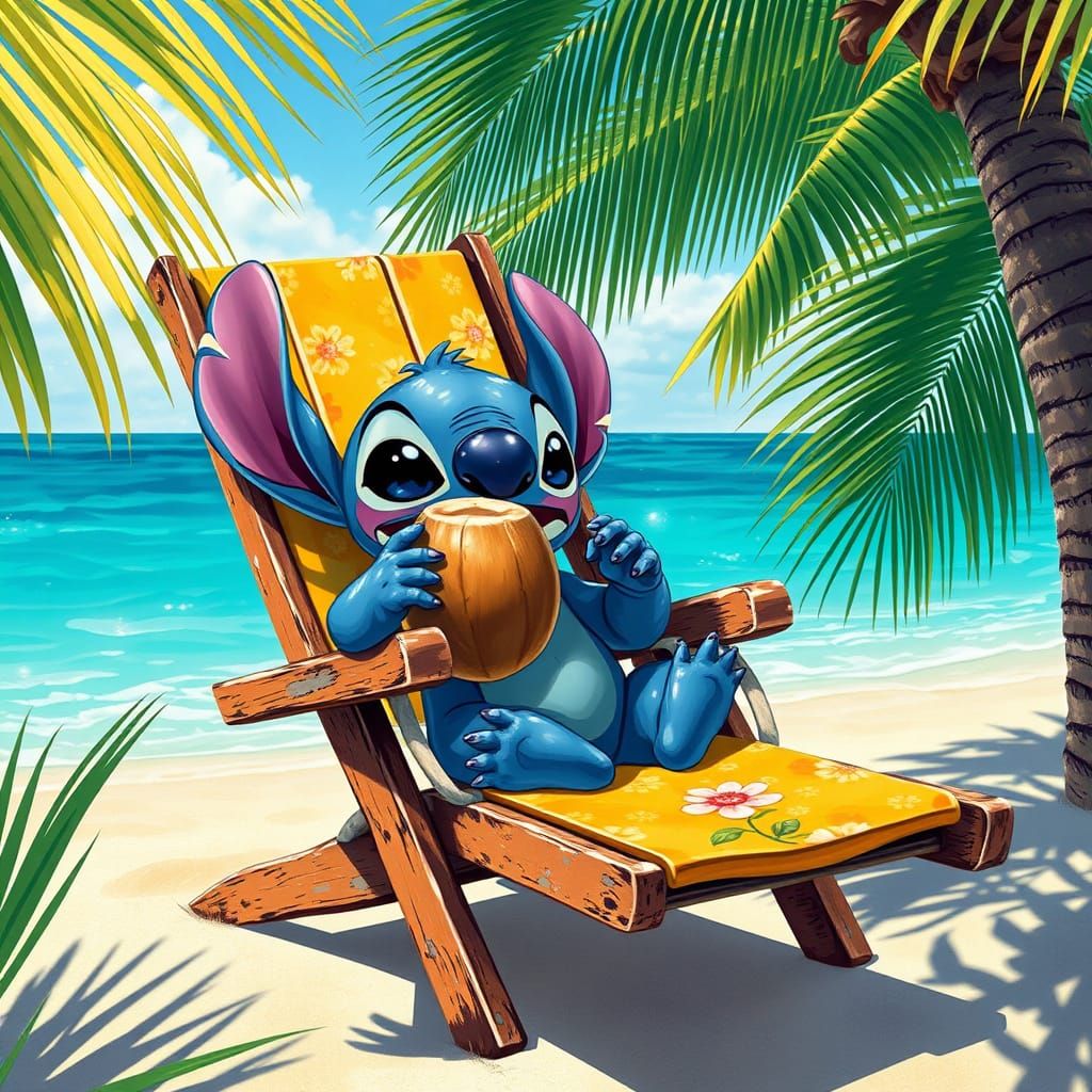 This image shows Stitch relaxing on a colorful beach, surrounded by palm trees and turquoise waters, as he takes a refreshing sip from a coconut in a vibrant, diamond art style, blending elements of digital painting and crystal textures.