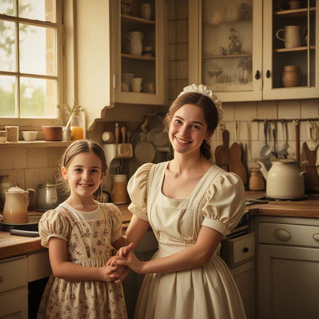This image depicts a smiling milkmaid and her daughter in a vintage kitchen, rendered in the style of an old master painting with soft, warm lighting.