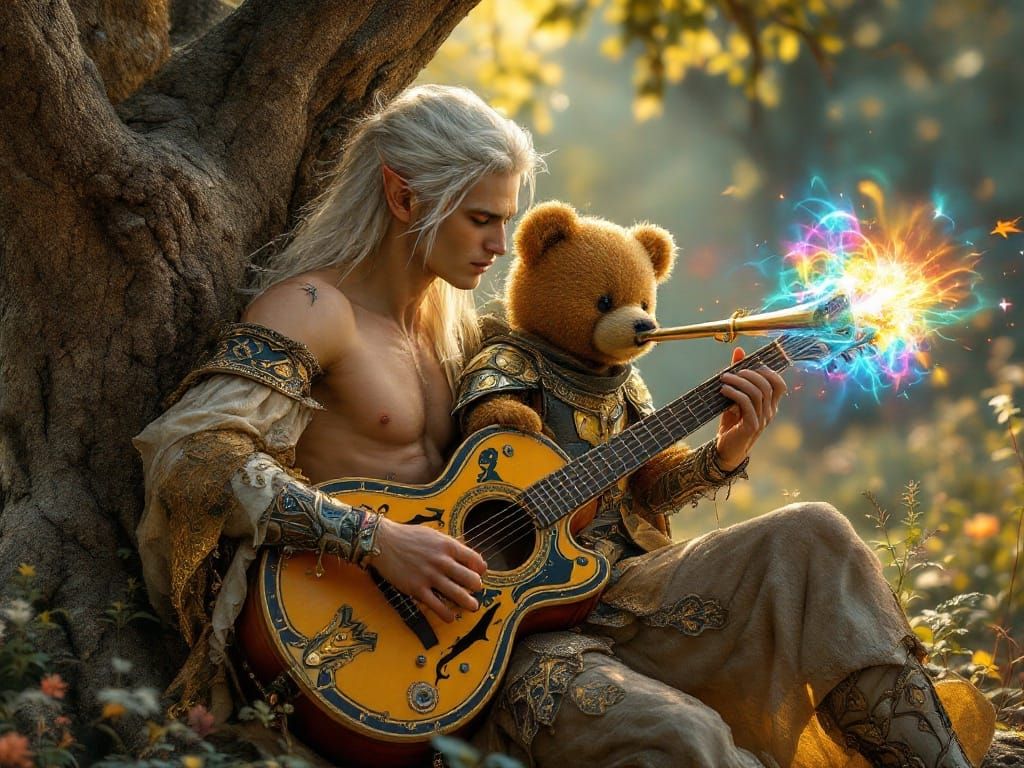 This image shows a disrobed alien elf playing a magical guitar, with a teddy bear knight playing a trumpet. The scene blends rustic and futuristic elements in a surreal, otherworldly atmosphere.
