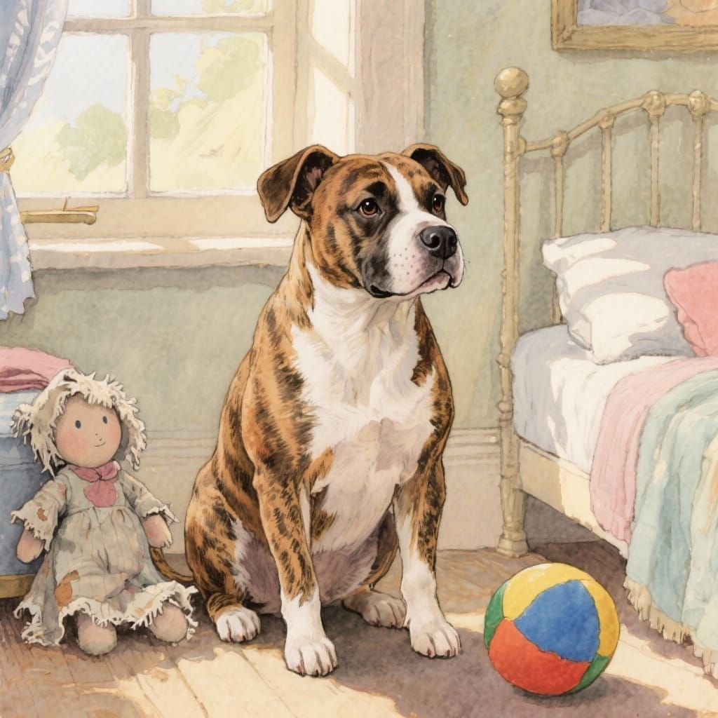 This image shows a brindle Staffordshire bull terrier in a child's bedroom with a rag doll and ball. Rendered in a detailed gouache style with soft brushstrokes and warm lighting.