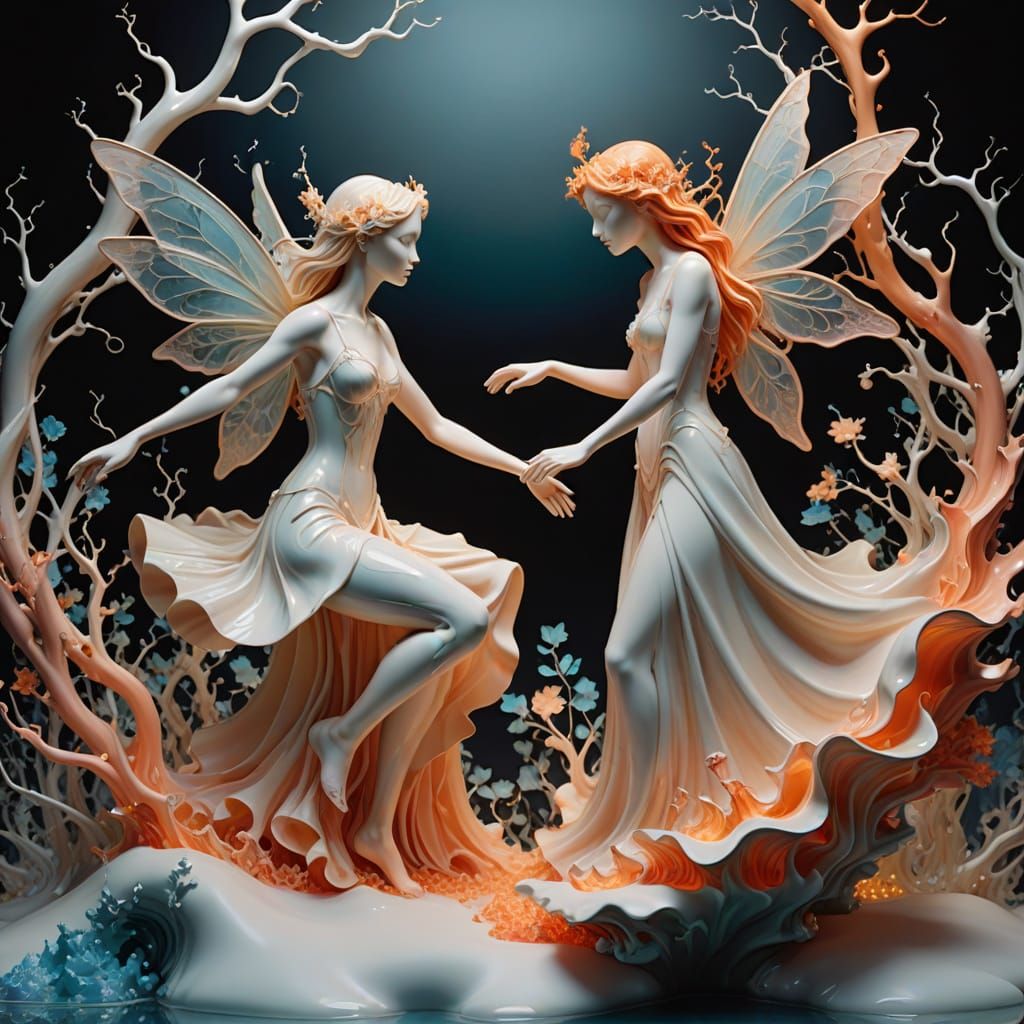 This surreal image depicts a vibrant dance between fire and snow fairies on a fractured porcelain surface. Contrasting elements blend with organic growths and mineral textures, rendered in luminous airbrushed colors.