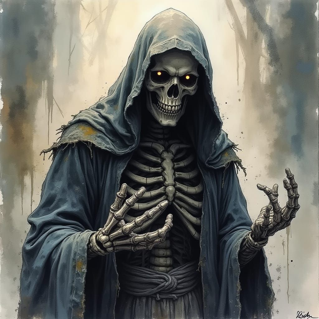 A striking picture of a skeleton shaman in tattered robes casting magic. This image showcases a dark and mystical scene with high-contrast elements and bold ink lines, reminiscent of watercolor techniques.