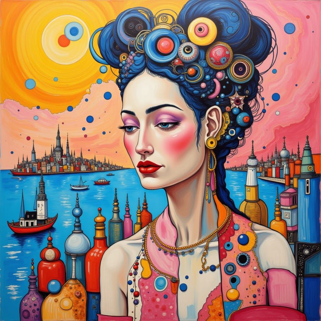 This image shows a woman with a high bun and beachy waves, adorned with vibrant jewelry, walking through an abstract, surreal fantasyland with a blueberry ink aesthetic.