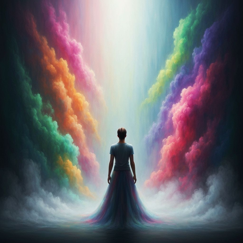 This image depicts a profound awakening where the walls of reality dissolve into swirling, vibrant mist. Features ethereal lighting and a sense of wonder, rendered in a surrealist style.