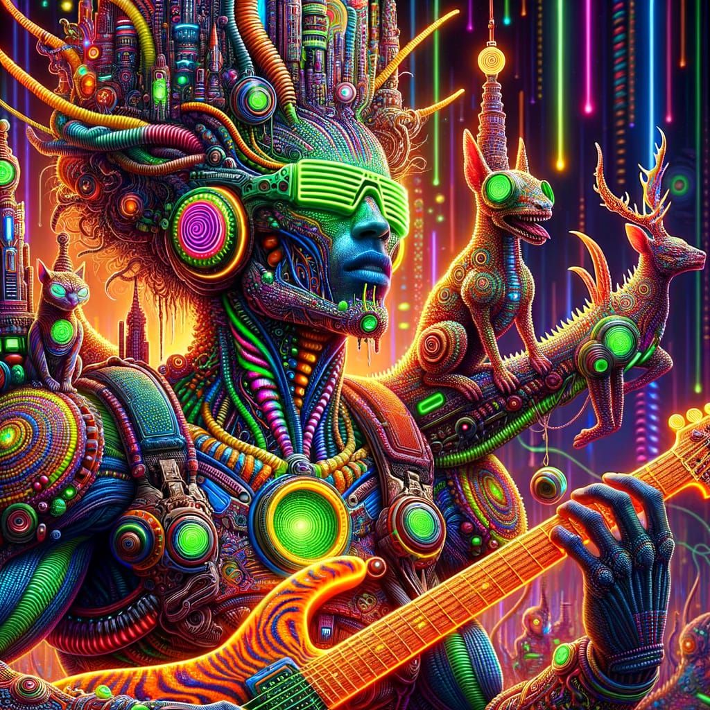 This image shows a detailed psychedelic sci-fi scene. A raver god with neon city structures on his head, electric guitar, and warlord armor. A hybrid creature rides a mythical beast, with an army on flying carpets. Features a fish-eye perspective and vibrant neon colors.