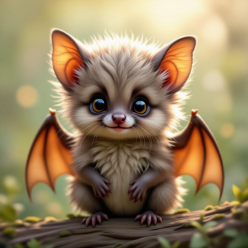 This image shows an adorable little bat with fluffy hair and big eyes. The highly detailed realistic style features delicate textures and subtle shading, evoking classic wildlife illustrations.
