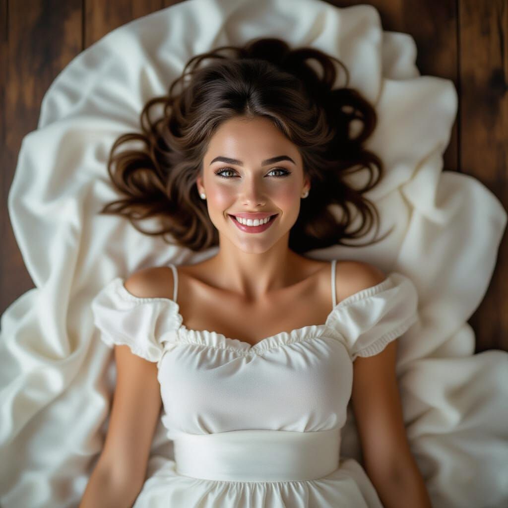 A striking cinematic image of a young woman in a bib, smiling on a solid wood floor with white silk. Captured with film grain and atmospheric lighting.
