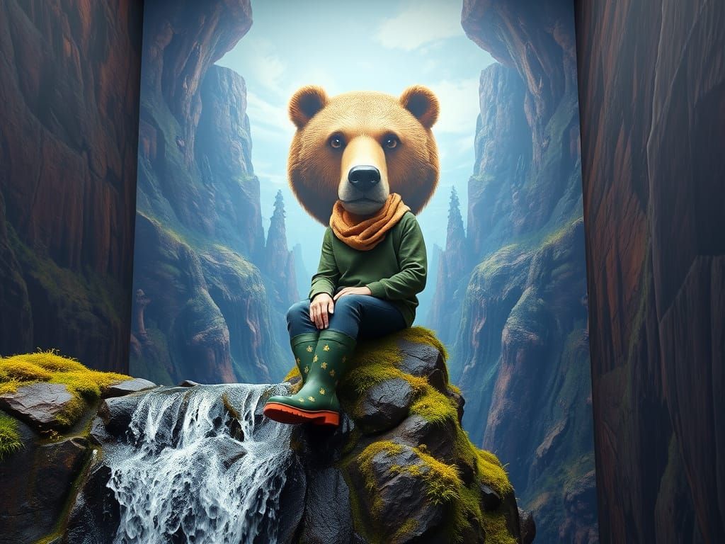 a fashion-conscious Weadlufy Deapa wearing whimsical over-sized gumboots, sits precariously on the edge of a moss-covered mock waterfall overlooking a vast, alien landscape with a life-like immersive trompe-l'oeil mural of a colossal, friendly bearhead emerging from the depths of a canyon on the alley ...