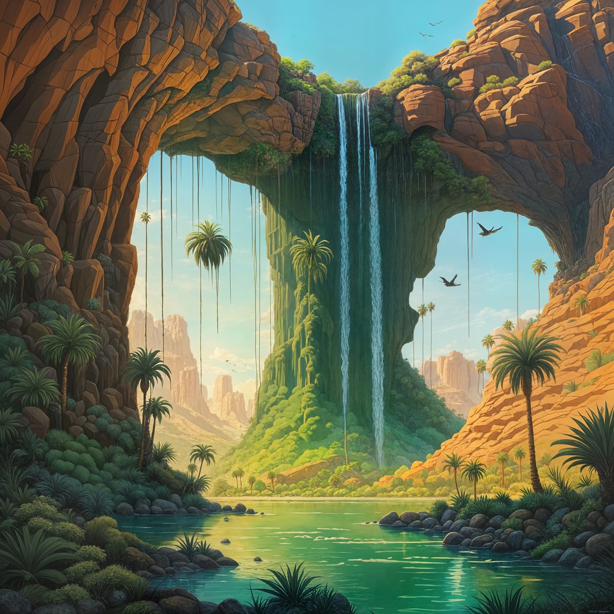 A hyperrealistic image of a tall waterfall cascading into a lush desert oasis. The scene is filled with palm trees, vibrant plants, and various bird species in sharp focus.