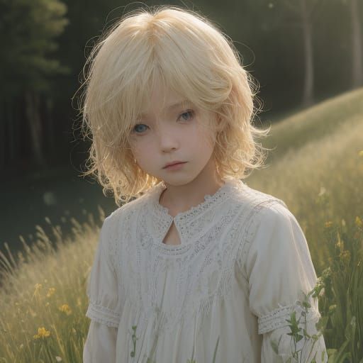 A watercolor painting of a blond European child in a sunlit meadow. The image features god rays, volumetric lighting, and a glowing aura in a whimsical style.