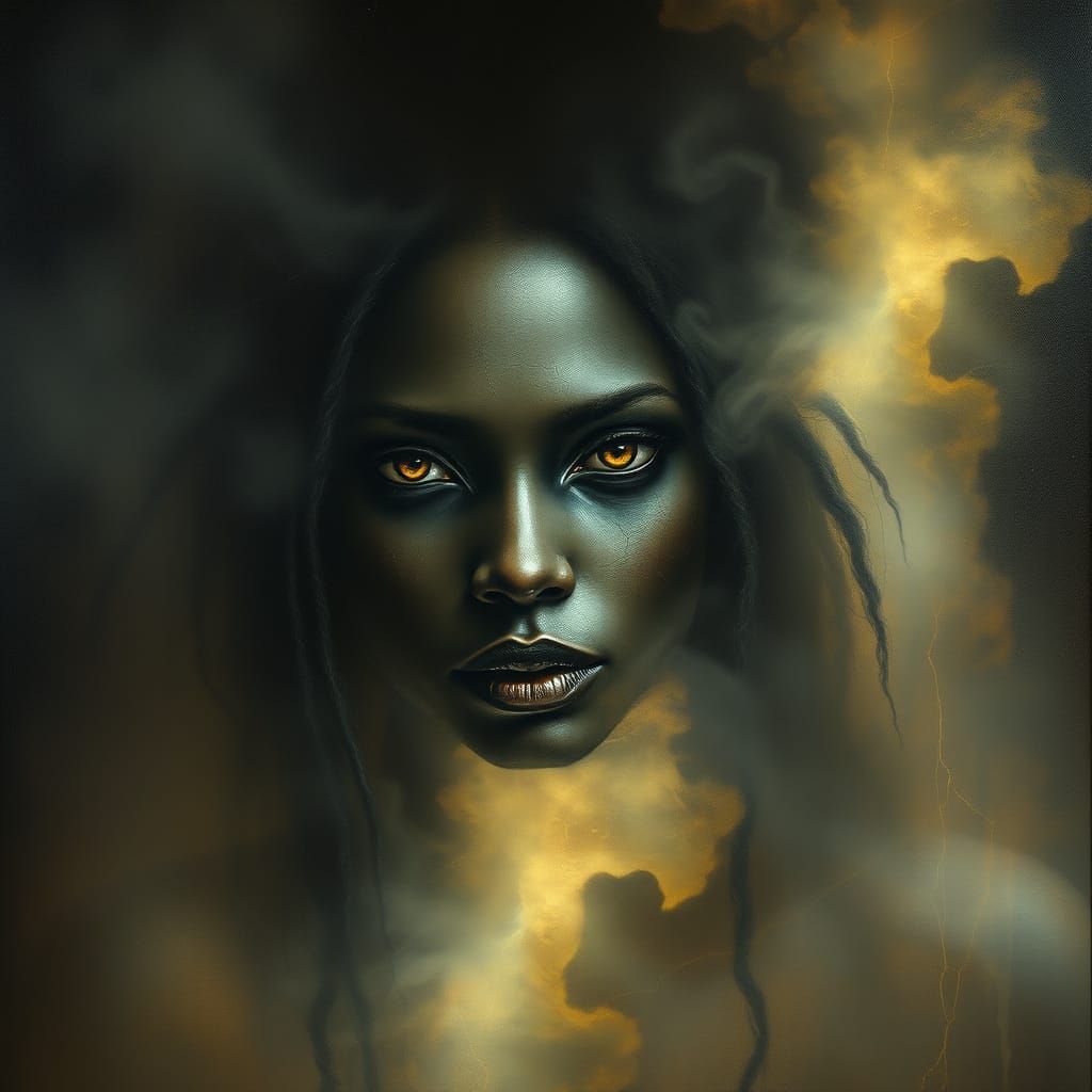 A dark fantasy portrait of a ghostly African woman blending into a cosmic fog. The eerie image features haunting light and a horror-like aesthetic, reminiscent of cracked oil paintings.