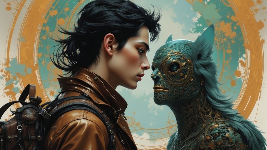 Concept art of a wanderer with an animal facing a mysterious figure in a desolate city. Features gritty realism, vibrant colors, and intricate details.