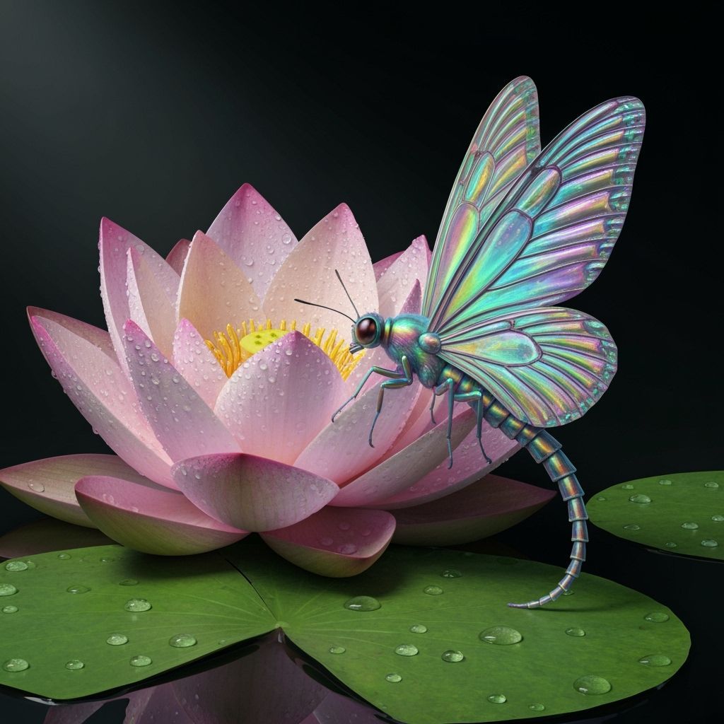 This image shows a rainbow butterfly-winged pixie resting on a lilypad. Next to her is a lotus flower covered in dew drops, all rendered as a highly detailed matte painting.