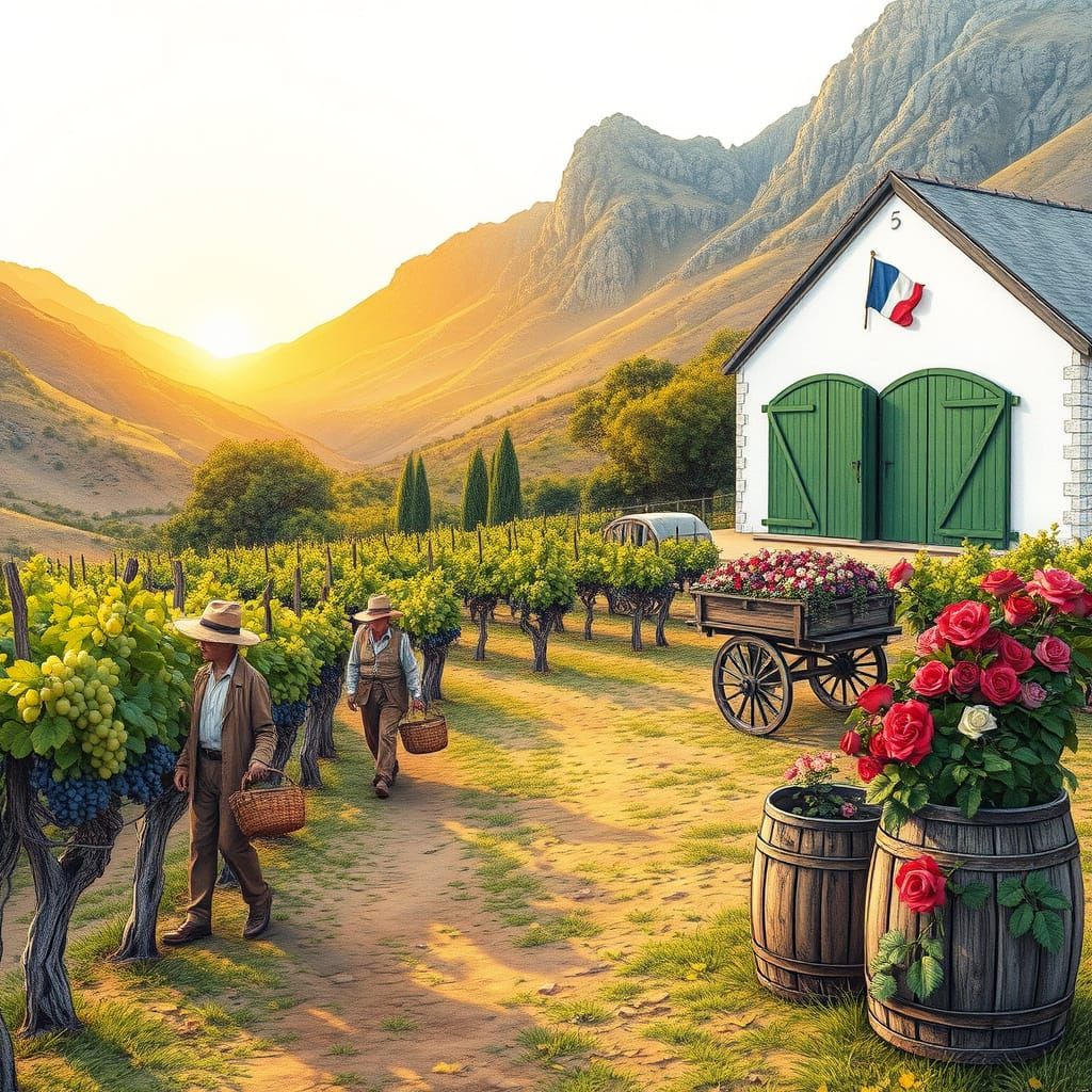 A serene and idyllic scene of an ancient vineyard at dawn, with fruit pickers harvesting grapes and horse-drawn carts laden with freshly harvested fruit, set amidst a picturesque Cape-Dutch-gabled cellar and lush greenery, reminiscent of French countryside charm
