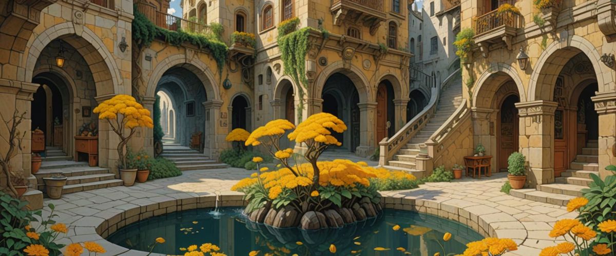 A vibrant comic book style alleyway with benches and arches. People stroll through the scene, which features M.C. Escher-inspired patterns and a travertine water fountain, all bathed in volumetric lighting.