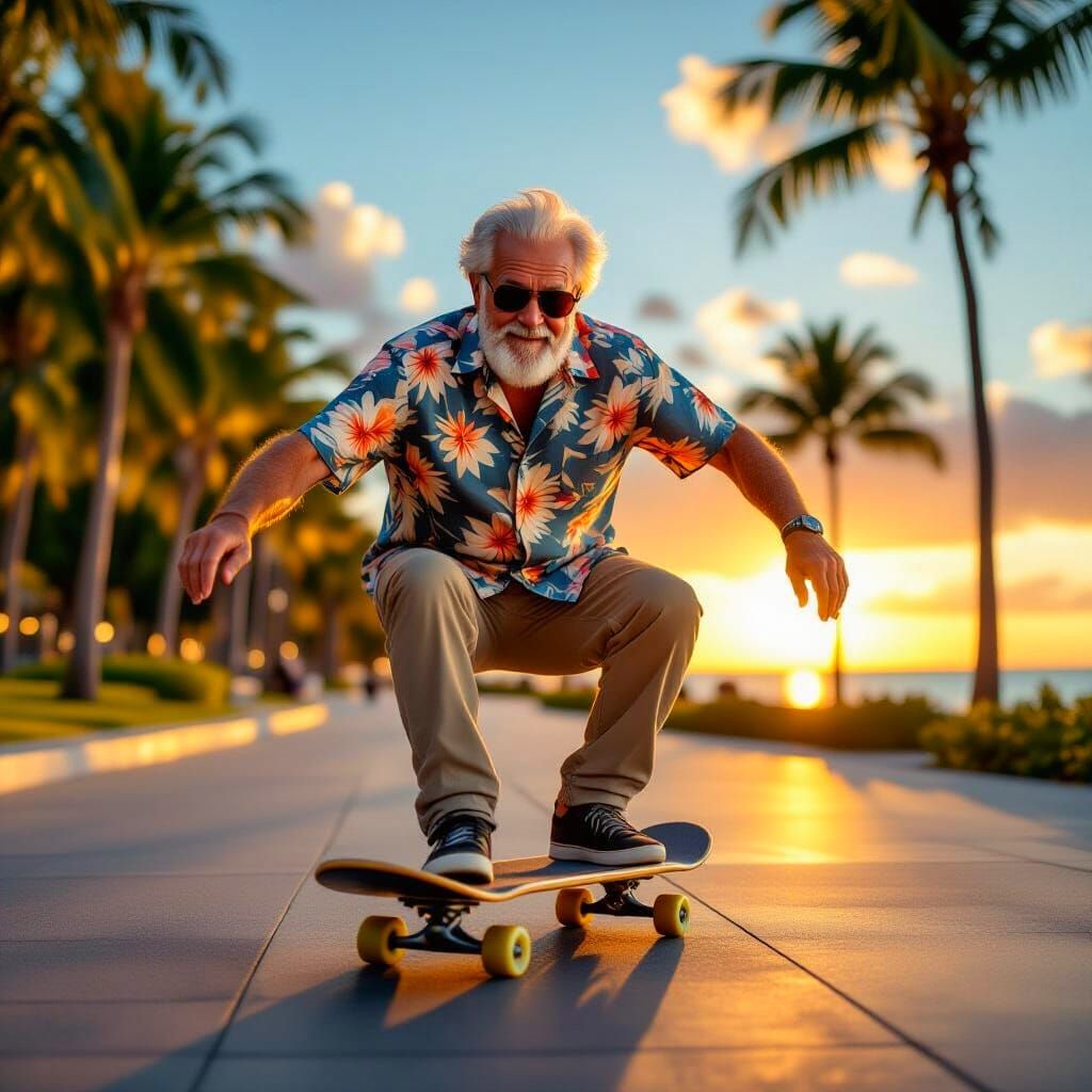 A vibrant macro photograph of an elderly man skateboarding at sunset. The image captures him gliding along a boardwalk in a Hawaiian shirt and sunglasses, with golden hour lighting and a shallow depth of field.