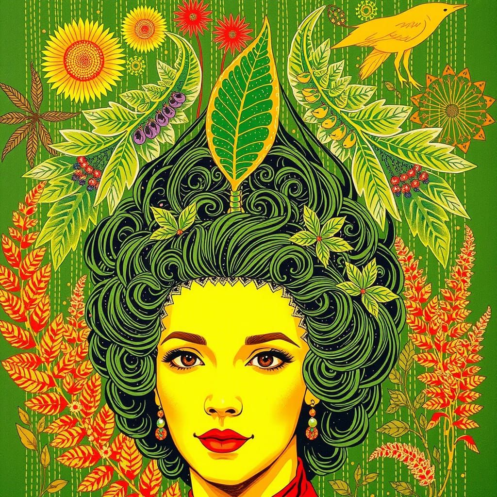 This image is a stunning example of a maximalist masterpiece, featuring intricate details and a palette of triadic colors that create a dramatic and atmospheric effect.