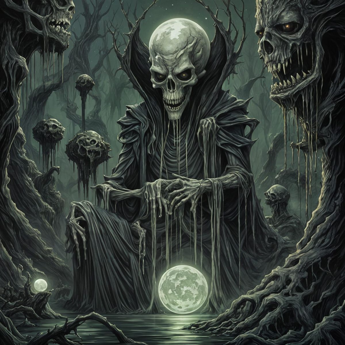 This surreal image depicts a skeletal, Gigeresque alien with a twisted frame, holding a green orb while seated on a menacing carved bone throne. Features a crimson moon and warped trees.
