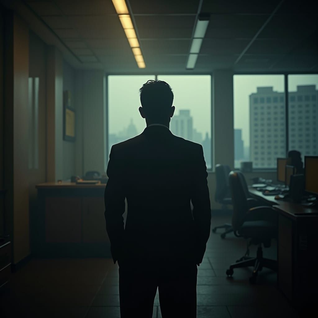 This image shows a determined entrepreneur in a dimly lit office with cityscape views. The shot features cinematic lighting, film grain, and a vignette, with a muted color palette to give an epic, live-action feel.