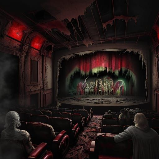 This image depicts a derelict movie theater from the 1930s with peeling paint and cracking walls. Demonic figures lurk within, creating a scene of psychedelic horror and dread.