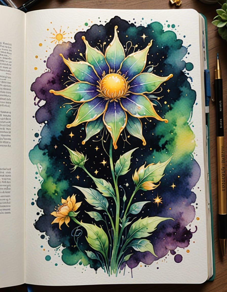 A striking picture of a bioluminescent star-shaped flower in a nature journal. The watercolor painting features floral tracery, delicate outlines, and warm golden lighting. Glowing green and purple hues create a dreamy aesthetic.