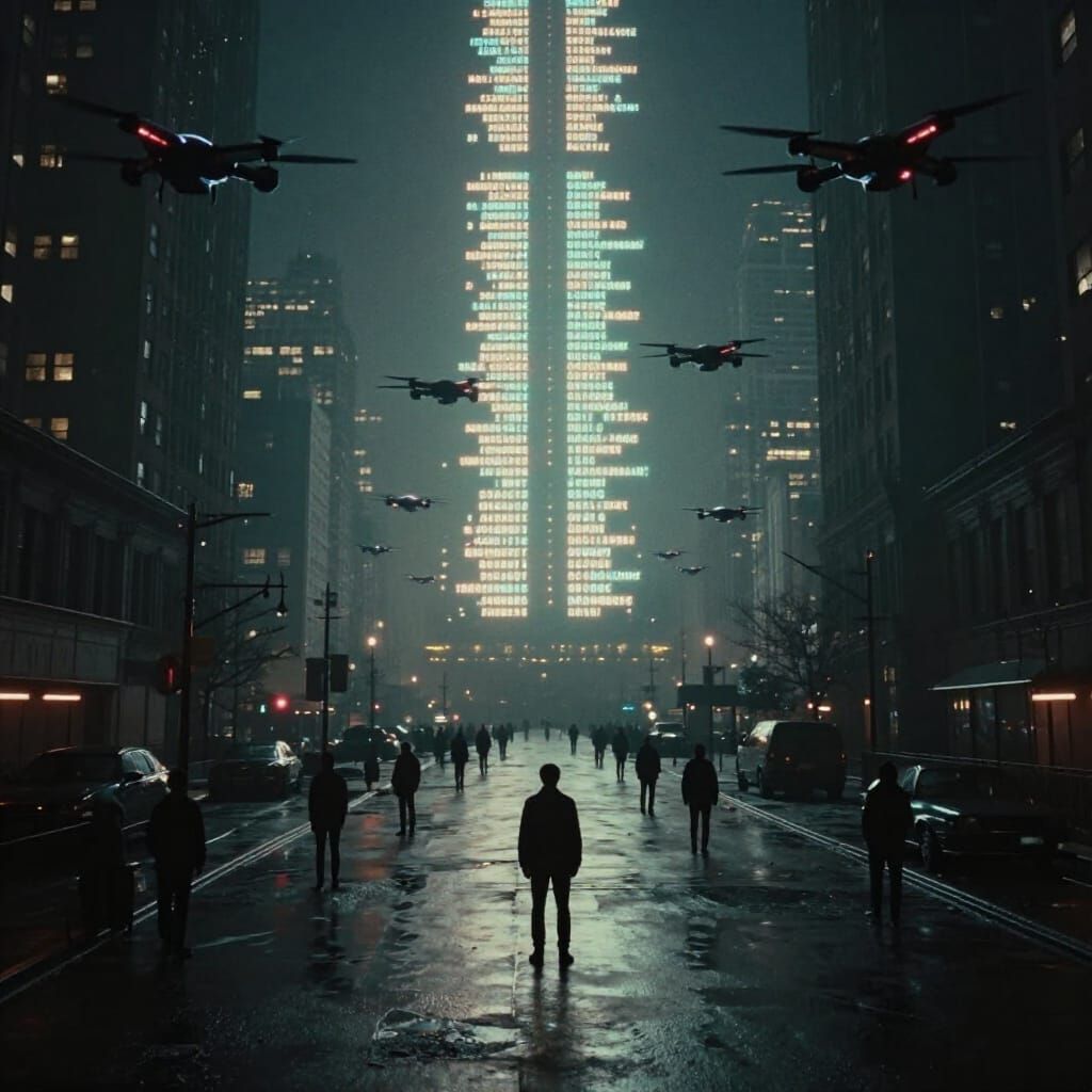 This image shows a dystopian New York City under a glitching sky, with drones hunting individuals. The scene is rendered with muted colors, neon accents, and a cinematic film look, creating a dreamlike yet ominous atmosphere.