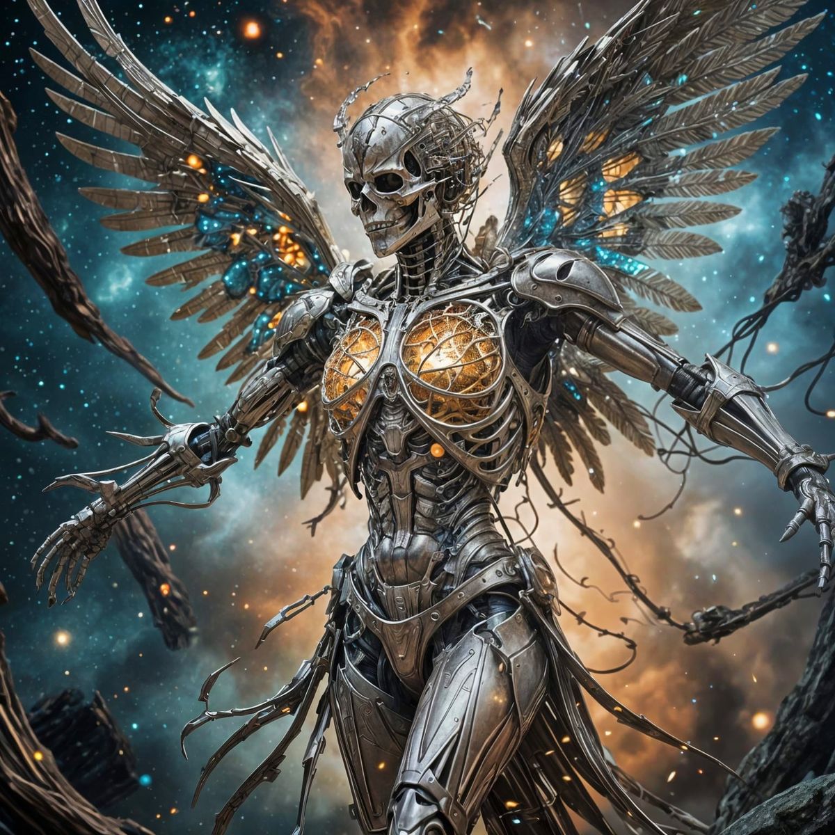 an epic extremely detailed of a titanium skeletal angel, 8k resolution, fantasy concept art, dynamic lighting, cinematic, epic glowing galaxy background, deep depth of field, 3D, constellation map, fractal crack effect, 16k resolution photorealistic, bokeh, a masterpiece by Alberto Seveso, breathtaking ...
