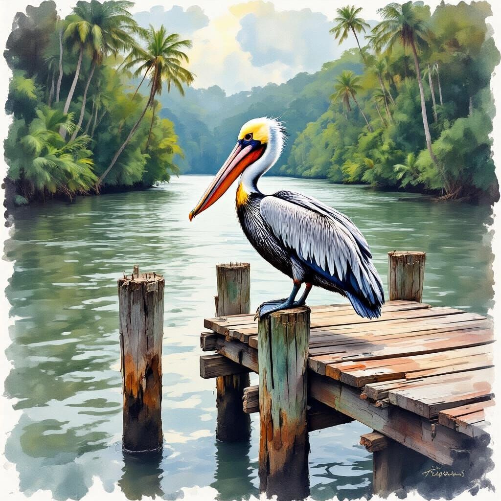 A vibrant watercolor and gouache painting of a pelican perched on a weathered pier piling, with a rainforest in the background. The image blends hyperrealism and impressionism.