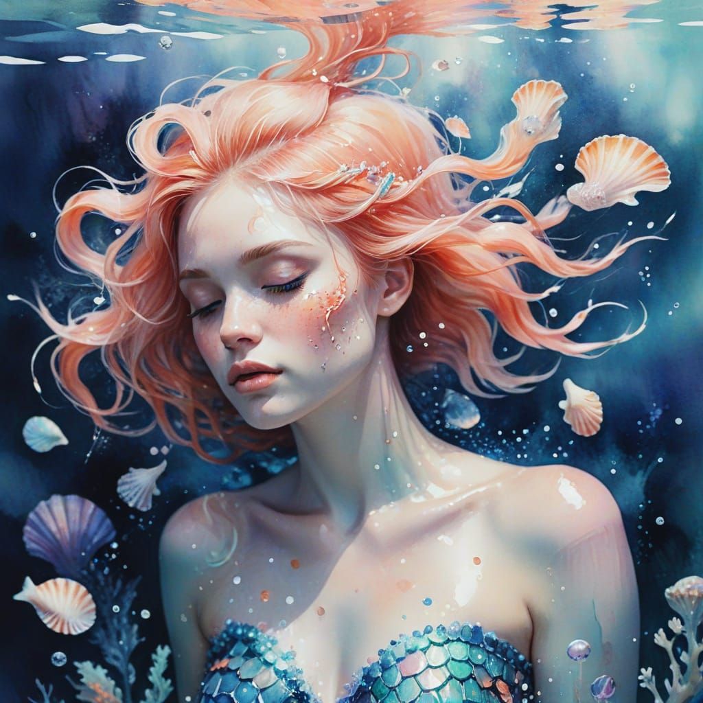A close-up watercolor painting of a celestial mermaid swimming through a coral reef. The dreamy scene is rendered in soft pastel colors with ethereal light and shimmering details.