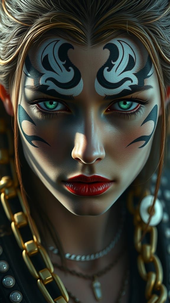 This image shows a woman's portrait, her face unique with piercing green eyes, awaiting judgment. The artwork features dynamic lighting, intricate detail, and volumetric effects, reminiscent of Artstation's trending styles.